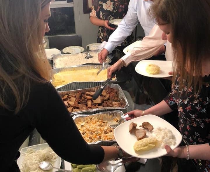 Several trays of food are displayed in a cafeteria-style setting, with different types of dishes in each tray. A hand holding a ladle is seen serving food from one of the trays, filled with a yellowish sauce. The closest tray in the foreground contains a dark, chunky stew-like dish.